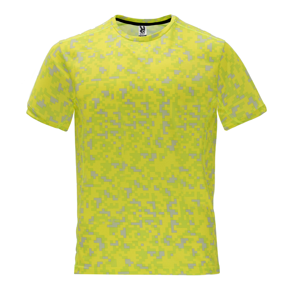 Κοντομάνικο, εμπριμέ, τεχνικό μπλουζάκι με στρογγυλή λαιμόκοψη με εσωτερικά ενισχυτικά γαζιά σε κίτρινο fluo.